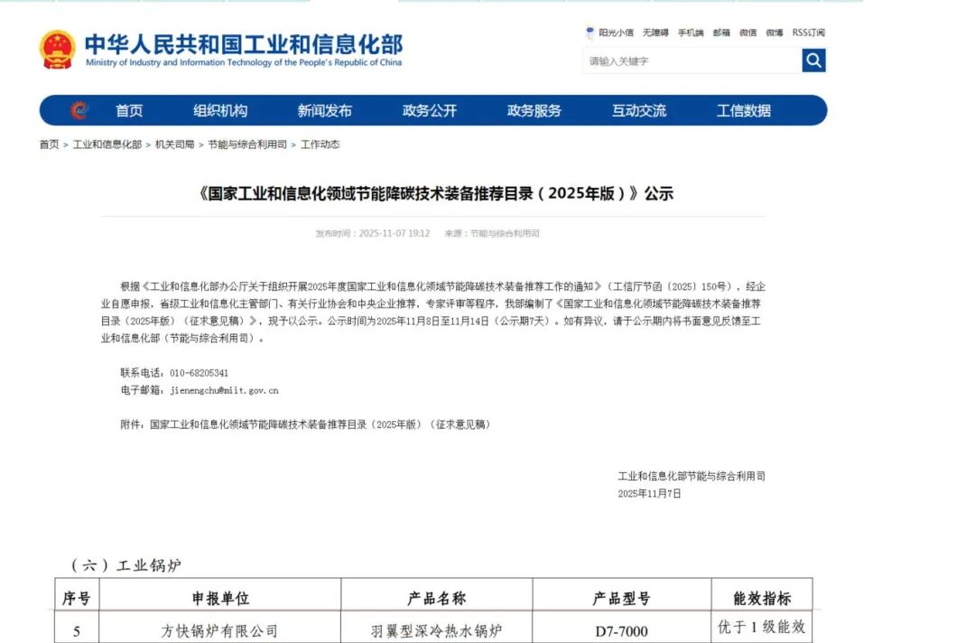 近日,工業和信息化部節能與綜合利用司發布《國家工業和信息化領域節能降碳技術裝備推薦目錄(2025年版)》,方快自主研發的“羽翼型深冷熱水鍋爐(型號:D7-7000)”,獲評“優于1級能效”,此次入選,是國家對方快在節能降碳技術領域持續創新的高度認可。